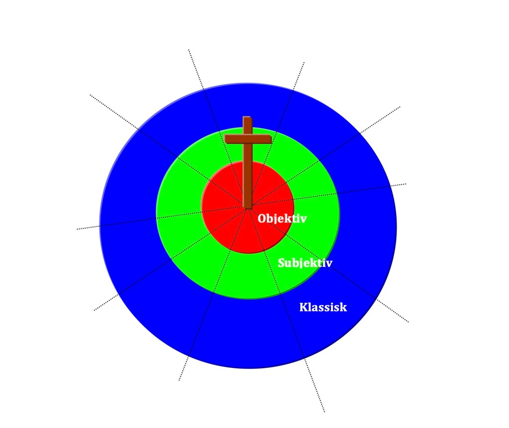 Objektiv, subjektiv og klassisk forsoningslære har alle noe å viktig å si oss fra Guds ord. Den objektive har mest å si om Jesu soning for våre synder. På figuren nedenfor står den derfor nærmest sentrum, som et dreiepunkt for KORSETS KRAFTFELT.